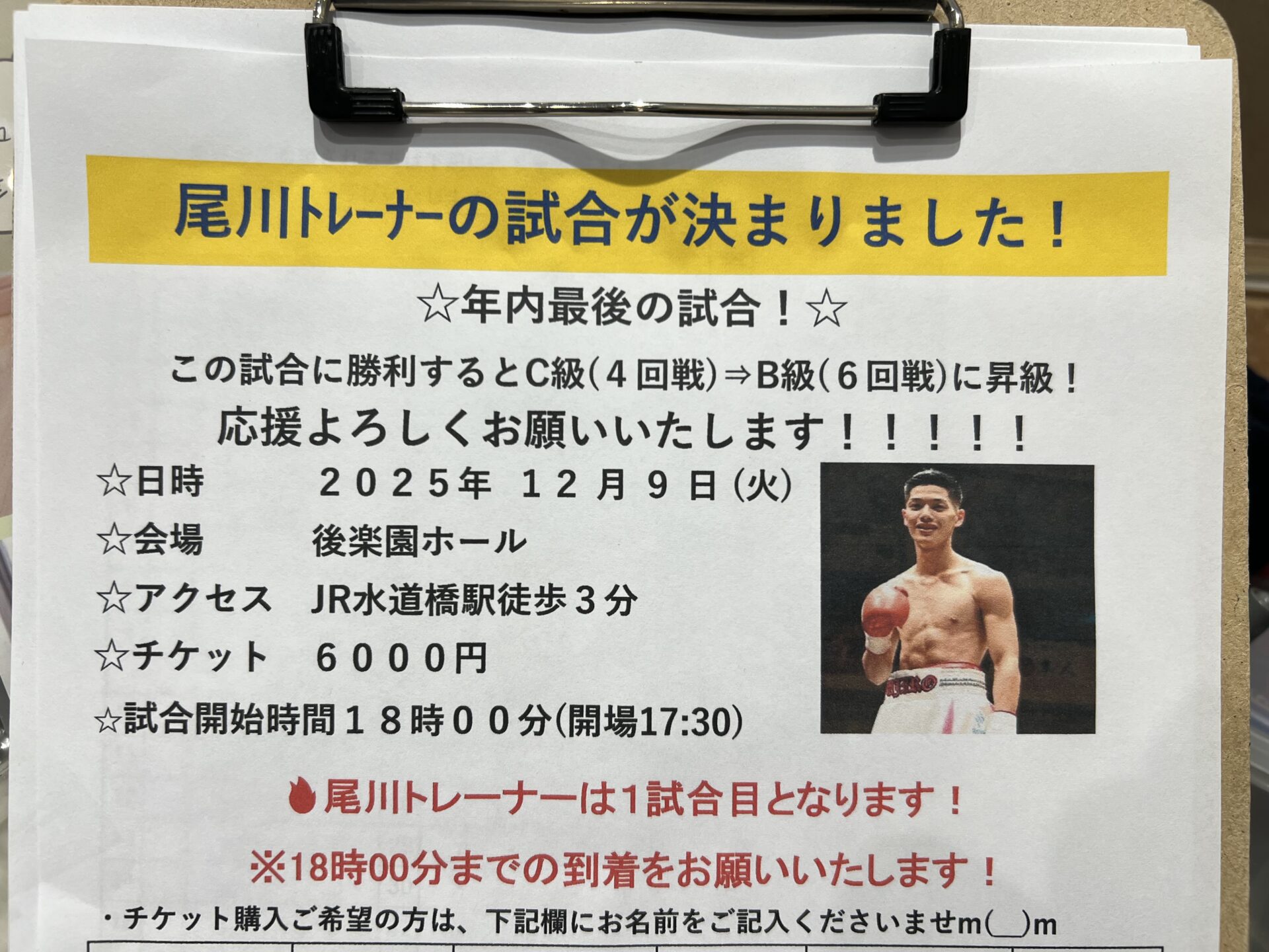 尾川トレーナーの試合&臨時休館日のご案内