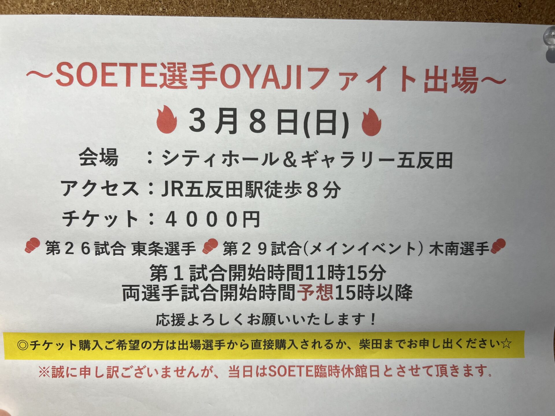 尾川トレーナーの試合&臨時休館日のご案内